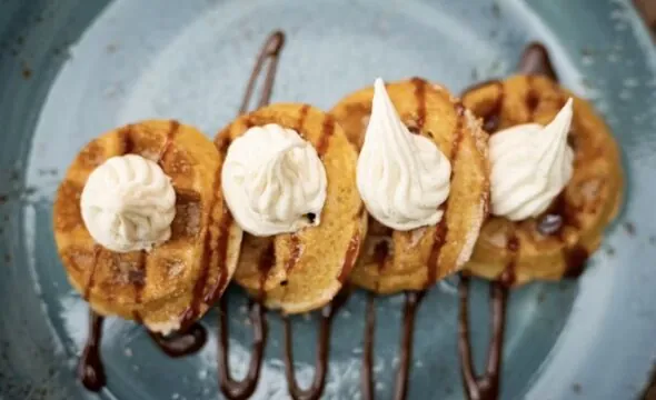 Churro waffle (w/syrup), tater tots, chicken bites, churros, eggs, bacon